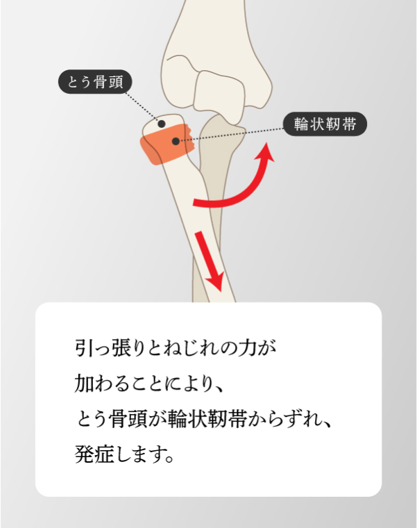 5歳以下の子どもに好発します。 輪状靭帯と橈骨頭(とうこつとう)が外れ亜脱臼を起こすことで発生します。